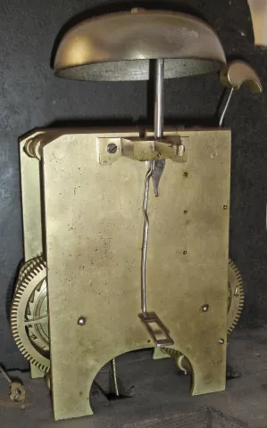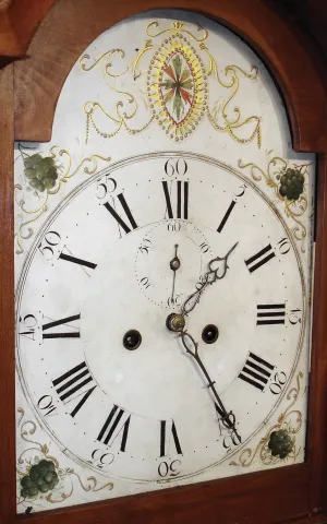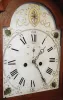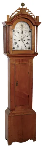 Unsigned New Hampshire tall clock, 8 days, time and strike, weight driven movement with typical New Hampshire cutouts in a maple and tiger maple case with full columns and fret work crest on hood with a painted metal dial, dated 1818 inside trunk door