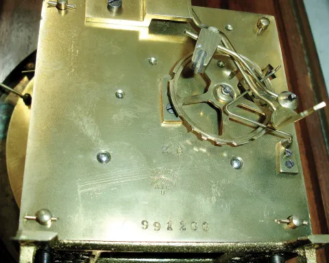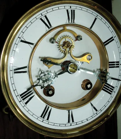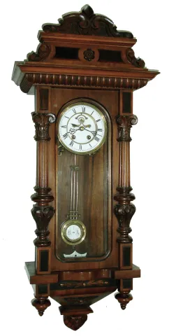 Lenzkirch, Germany, walnut, 8 days, time and strike, spring driven, R/A with rare visible jeweled escapement, c1875 this rare clock with visible escapement is in excellent original condition with an old finish and no losses or damage to the ornate carved case, just some old woodworm holes. The white enamel on the dial, beat scale, and pendulum bob are all fine. The front glass may be newer. The signed movement appears clean, complete and working, but was not tested. Ht 37Ò