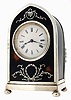 England, lancet arch-shaped desk clock, silver gilt frame on compressed ball feet, with London hallmark and date letter for 1907. The front and sides have tortoise shell panels and engraved silver inlay, Roman numeral white enamel dial, blued steel hands, French, 8 days, timepiece movement with lever platform gilding worn away, shell with one minor split, and with uneven gloss, dial and hands good, but very dirty, running, Ht 4 3/4Ò