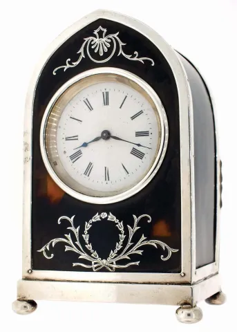 England, lancet arch-shaped desk clock, silver gilt frame on compressed ball feet, with London hallmark and date letter for 1907. The front and sides have tortoise shell panels and engraved silver inlay, Roman numeral white enamel dial, blued steel hands,