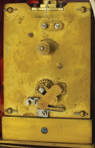 gilding worn away, shell with one minor split, and with uneven gloss, dial and hands good, but very dirty, running, Ht 4 3/4Ò