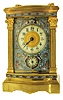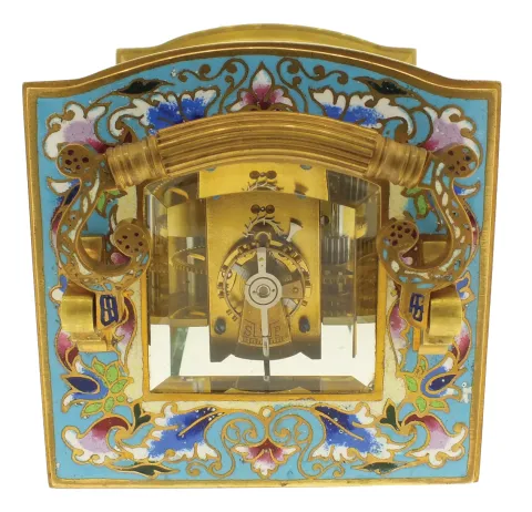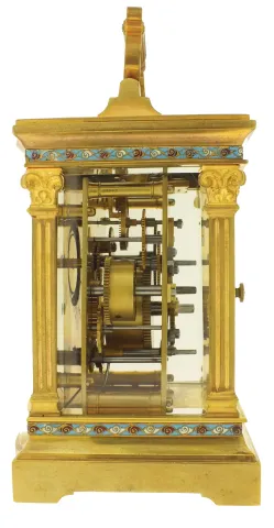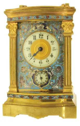 France, carriage clock with champleve enamel, gilt bowed front case, fluted pilasters with classically inspired capitals at the corners, Arabic numeral enamel dials with champleve mask, blued steel hands, 8 days, timepiece movement with jeweled lever