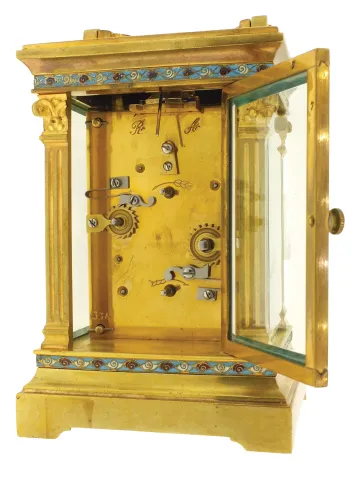 France, carriage clock with champleve enamel, gilt bowed front case, fluted pilasters with classically inspired capitals at the corners, Arabic numeral enamel dials with champleve mask, blued steel hands, 8 days, timepiece movement with jeweled lever platform and alarm, sounding on a bell concealed in the base, c1900 case with wear and losses to gilding, enamel with a few minor losses, one corner of top glass with minor chip, dials and hands good, movement running, alarm functions properly, Ht 6 3/4Ò to top of handle