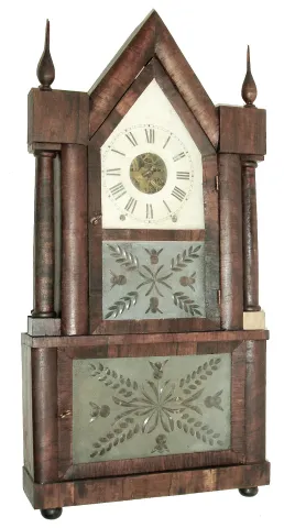Clocks- 3 (Three) Connecticut shelf clocks: (1) Birge & Fuller, Bristol, Conn., 8 days, time and strike, brass movement wagon spring powered double steeple shelf clock, c1845; (2) Attributed to Norris or Ethel North or Erastus Hodges, Torrington, Conn