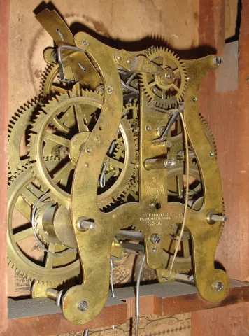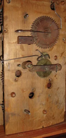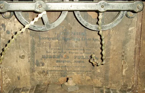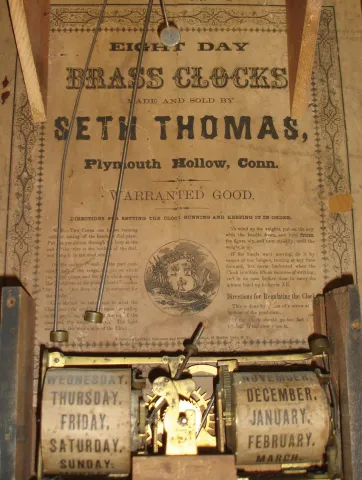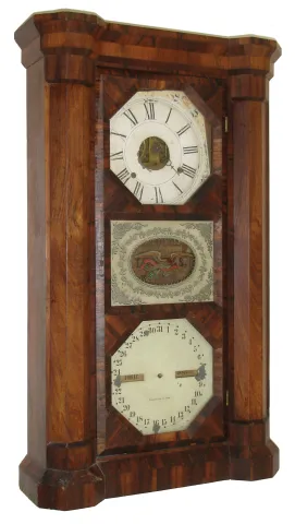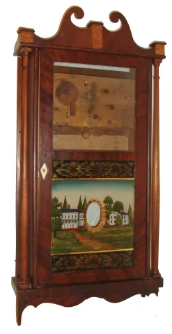 Mahogany veneered case in an old finish with loss and repairs on the base. Period dial may not be original as it seems too small for the case. The movement is the proper, however. The screw that holds the leaf springs together is not original. Some of the wagon spring mechanism is missing in clouding the long cast piece that is found under the base to equalize the load on the leaf springs and the rectangular piece found on each end of the main leaf spring that controls the two control arms. Another example of this case with identical tablets in the Henry Ford Museum is shown in PalmerÕs ÓTreasury of American ClocksÒ p. 100. There are no hands or pendulum. Ht 27Ó; (2) The dial, hands, weights and finials are absent. The movement does not fit this case. The lower portion of the backboard is missing, thus no label. Parts of the feet are missing. The glass tablet is by Moberg and done on the original glass. Ht 28Ò; (3) CASE: Original finish; Worn or rough, with some veneer loss. DIAL: Original; Flaking at Winding/Screw Holes; Flaking at Center Arbor. MOVEMENT: Original. LABEL: Original. TABLETS / GLASSES: Original with American Eagle Fenn glass as the center tablet,. PENDULUM: Original. HANDS: Original. WEIGHTS: Absent. HEIGHT: 30 1/2Ó. NOTE: This clock has several issues. The case backboard has been significantly altered or replaced. The support brackets for the calendar mechanism have been removed from the backboard as have the support brackets for the time & strike movement. There is no minute hand or calendar hand. Ht 30 1/2Ò