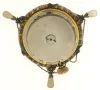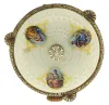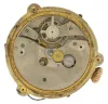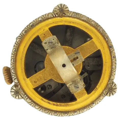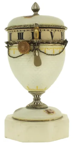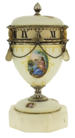 France or Switzerland, miniature urn form annular clock, the silver gilt case with translucent, white guilloche enamel with gilt ornament and 7 polychrome enamel portraits, finial and stem with white enamel accents, silver chain swags with translucent stone teardrop shaped pendant drops below the Roman numeral silvered dial, all on an octagonal, polished stone base, c1900 very good, enamel without damage, gilding on silver components worn away, pendant drops dirty, and reattached to their mounts, dial numerals with minor losses and touch ups, stone base with a few very tiny flakes, Ht 4 1/2Ó