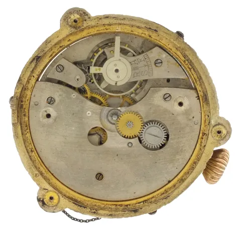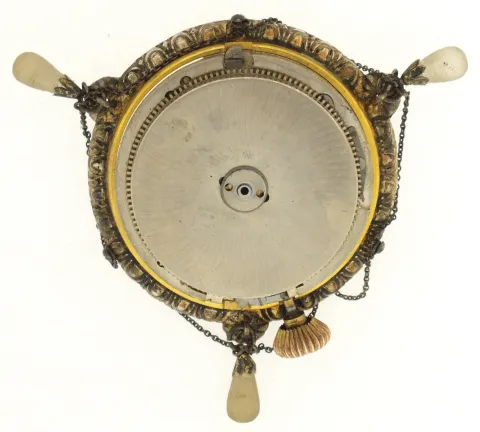 France or Switzerland, miniature urn form annular clock, the silver gilt case with translucent, white guilloche enamel with gilt ornament and 7 polychrome enamel portraits, finial and stem with white enamel accents, silver chain swags with translucent
