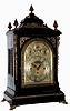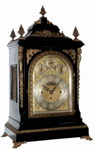 English, triple fusee, quarter chiming bracket clock, in a classic Georgian style large ebonized case with brass caryatids, side frets and pineapple finials, the whole resting on cast ÒtoedÓ feet, chiming your choice of Whittington on 8 bells or