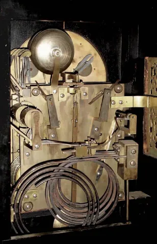 although the gongs and hands have some bits of surface rust, the cast brass trim is still in good condition, and the raised and gilt numerals on the fancy chapter ring are still fine; gilt dial spandrels still bright. There is a split in the case front above 12, some scrapes and loss of finish here and there. The rear bell support has been replaced with a hand made one, quite substantial, and the center of the largest bell has been repaired [rings OK] (see close image on internet). Overall in good condition. Ht 27 1/2Ò