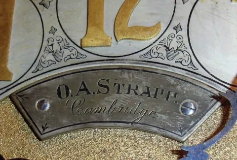 English, triple fusee, quarter chiming bracket clock, in a classic Georgian style large ebonized case with brass caryatids, side frets and pineapple finials, the whole resting on cast ÒtoedÓ feet, chiming your choice of Whittington on 8 bells or Westminster on 4 large flat wire gongs, and then sounding the hours on a still larger steel flat wire gong, the clock retailed by O. A. Strapp, Cambridge, and with an engraved cartouche below 12 bearing that information, and the arched dial with small subsidiary dials labeled Chime /Silent, F/S, and Chime on 8 Bells or Westminster, c1875 although the gongs and hands have some bits of surface rust, the cast brass trim is still in good condition, and the raised and gilt numerals on the fancy chapter ring are still fine; gilt dial spandrels still bright. There is a split in the case front above 12, some scrapes and loss of finish here and there. The rear bell support has been replaced with a hand made one, quite substantial, and the center of the largest bell has been repaired [rings OK] (see close image on internet). Overall in good condition. Ht 27 1/2Ò