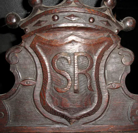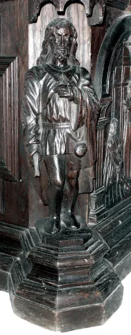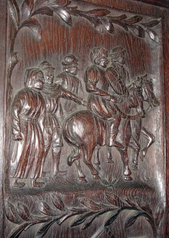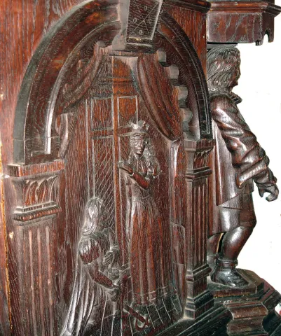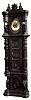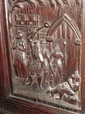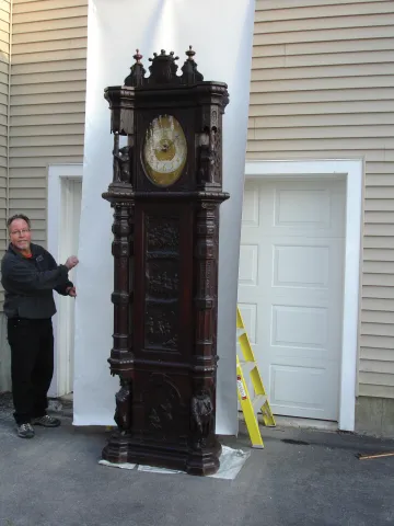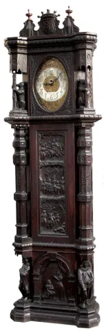 English monumental tall case clock, 8 days, time, strike and chime, three brass weight driven, chain pull Elite, Germany movement in a dark oak case with highly detailed carvings including three panels on the trunk with medieval scenes flanked by carved columns above carvings of gentlemen in medieval garb in full relief and another panel with knight on bended knee. The dial is brass with a silvered chapter ring, c1900 the case retains its original finish and the two upper finials and bear carvings flanking hood are replacements. The Elite movement has a strike hammer broken and detached, but included and the gongs are period but replacements. Ht 116Ò (Just under 10 feet)