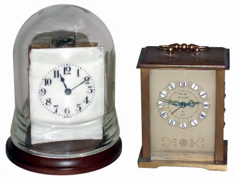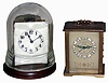 Clocks- 2 (Two) French, 8 days, time only carriage clocks; lever-escapement 11 jewel movement for John Wanamaker, no brass case, now mounted to pocket watch display; Relide 15 jewel with alarm; 20th century both tick and set, but not tested long term and sold as is with no further details available. Ht to top of heavy glass dome 5 1/4"