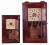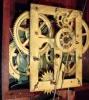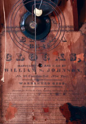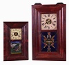 Clocks- 2 (Two) OG's and two wooden shelves: (1) William Johnson OG with alarm, 8 days, weight driven; (2) New Haven, 8 days, miniature OG; (3) large unfinished rustic shelf made from type of softwood; (4) banjo presentation base cherry shelf with "acorn" motif at bottom and girandole accents Both sold as is: (1) rustic shelf is crudely built and possesses several nicks and flaws. Length 36" Ht 11"; (2) cherry shelf has been coated with a urethane, with losses to finish, particularly along top edge. Length 16" Ht 14"