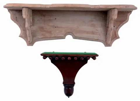 Both sold as is: (1) rustic shelf is crudely built and possesses several nicks and flaws. Length 36" Ht 11"; (2) cherry shelf has been coated with a urethane, with losses to finish, particularly along top edge. Length 16" Ht 14"