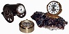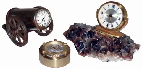Clocks- 3 (Three) modern novelty clocks: Sindaco Swiss 1-jewel in bronze cannon; Chelsea/Shreve, Crump & Low small nautical theme with Japanese battery movement; LeCoultre 8 days, alarm clock on rock crystal base; 20th century all three appear to be in very good original condition but were not tested and are sold as is. Ht of clock on crystals is 4"
