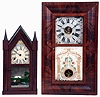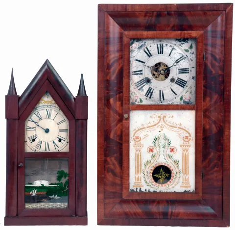 Clocks- 2 (Two): (1) J. S. Flet, Portland, Maine, overpasted label on a Brewster & Ingrahams 30 hours, time and strike, brass spring driven movement sharp gothic or steeple clock, c1848. (2) Elisha Manross, Bristol, Conn., 30 hours, time and strike, weight driven brass movement OG shelf clock, c1845. (1) Mahogany veneered case in original finish with a small chip on the back edge on the base and damage to the right spire tip. Original dial plate has been poorly repainted with huge numerals. Original hour hand, missing minute hand. Original decalcomania tablet. Signed movement retains original brass springs. (2) Beautifully figured mahogany veneered case in an old finish with veneer chips on the outer flat banding. Original Fenn tablet has loss at bottom. Original hands and dial with scattered loss.