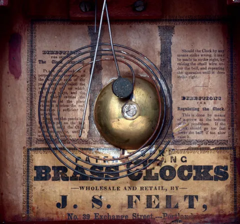 Clocks- 2 (Two): (1) J. S. Flet, Portland, Maine, overpasted label on a Brewster & Ingrahams 30 hours, time and strike, brass spring driven movement sharp gothic or steeple clock, c1848. (2) Elisha Manross, Bristol, Conn., 30 hours, time and strike,