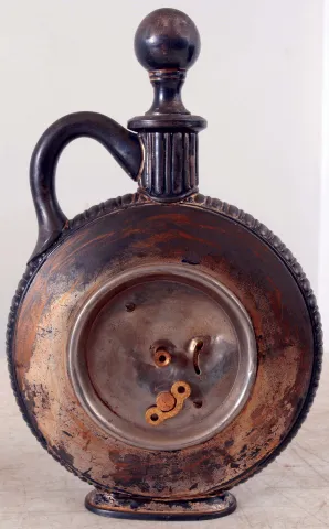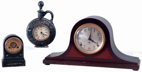 Clocks- 3 (Three) American: (1) Terry Clock Co., Waterbury, Conn. "Patent Alarm Time-Piece" in an iron front case with a spring driven, 30 hours, time and alarm movement, c1870. (2) Seth Thomas Clock Co., Thomaston, Conn. "Sentinel 2" tambour mantle clock in a mahogany case with a spring driven, 8 days, time and hour/half-hour strike No. 89 movement, c1928. (3) Ansonia Clock Co., New York, NY, "Jug" novelty shelf clock in a silver and gilt finish with a 30 hour timepiece movement, c1886. (1) The case is in very good condition with only minor paint loss. The paper dial and hands original. Ht 6". (2) The case retains original finish. The dial and hands original and in good condition. Ht, 9". (3) The silver plated case finish is worn. The paper dial and hands are original and in good condition. Ht 9 3/4".