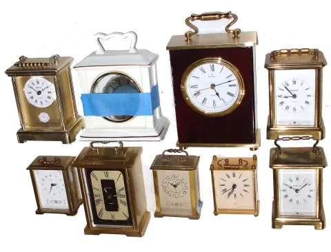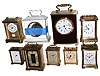 Clocks- 11 (Eleven) modern carriage clocks: including 4 French 8 days, Bayard, Relide and Solo; 7 with quartz movements in brass and glass cases; later 20th century nearly all are in very good original condition, with some tarnish on the 8 day clock cases. None tested, sold as is, no further details available. The largest, by Montreux, is 8 1/2" high