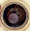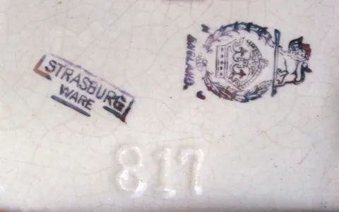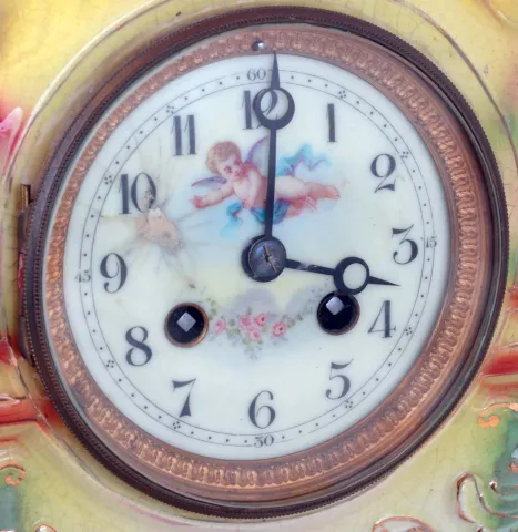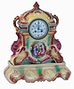 England, Strasburg Ware clock, with French movement, colorful earthenware case, enamel scene with figures in a landscape below the dial, Arabic numeral white enamel dial with putto and floral festoon, the case resting on its original Strasburg Ware base, 8 days, time and strike movement, c1920 base with small chip and crazing, clock with crazing, minor losses to gilt highlights, dial with filled loss and hairlines, hands replaced, ticks and strikes, 18"h x 15"w