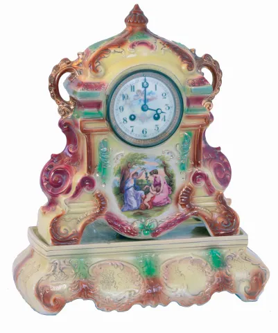 England, Strasburg Ware clock, with French movement, colorful earthenware case, enamel scene with figures in a landscape below the dial, Arabic numeral white enamel dial with putto and floral festoon, the case resting on its original Strasburg Ware base,