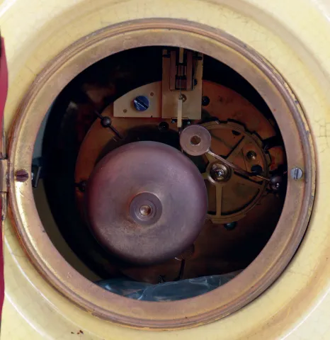 base with small chip and crazing, clock with crazing, minor losses to gilt highlights, dial with filled loss and hairlines, hands replaced, ticks and strikes, 18"h x 15"w