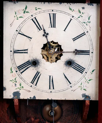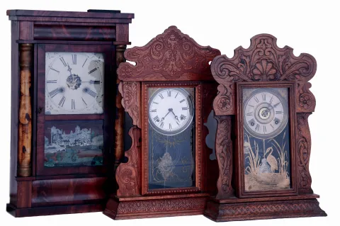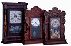 Refinished mahogany veneered case with couple chips on the base and a piece missing on the upper left side. Original painted dial is soiled at the winding arbors and some loss at the mounting pins. Original tablet with loss. Hands are not original. Remains of a label inside the case. (2) Embossed oak case in an old finish. Original paper dial is stained. Original hands and tablet. (3) Embossed oak case in an old finish. Paper dial has been replaced. Original hands and pendulum. Tablet is a replacement.
