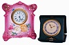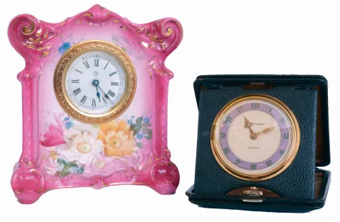 Clocks- 2 (Two): An Ansonia Royal Bonn desk or bedside clock, pink case with floral decoration, 30 hours timepiece movement, and a Waltham folding travel clock, painted metal dial with fancy gilt hands, 8 days timepiece movement, both c1900 both in good condition, running