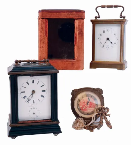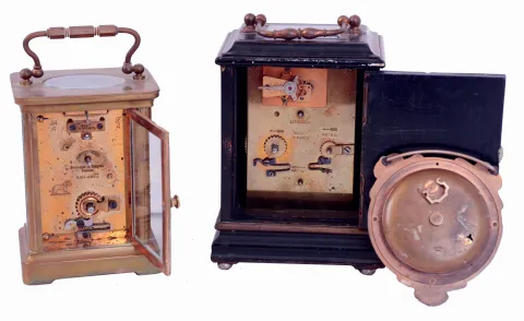 Clocks- 3 (Three): Two French carriage clocks, the first by Rollin a Paris, ebonized wood case with brass stringing and moldings, beveled glass at top and front, Roman numeral white enamel dial, 8 days time and alarm movement with lever platform, mid 19th