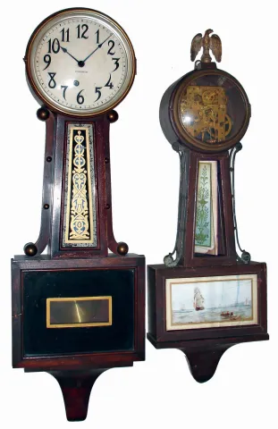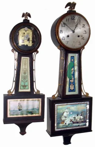 Clocks- 4 (Four) banjo clocks, mahogany, 8 days, Connecticut hanging clocks: New Haven, 8 days, time and strike, Waring, Whitney and smaller time only; and an Ingraham "Nyanza" time only. Early 20th century