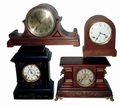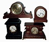 Clocks- 4 (Four) Connecticut wood case, 8 days, time and strike mantel clocks: Ingraham "Signet" and "Galatea"; Sessions round top; and unsigned fancy tambour; early 20th century