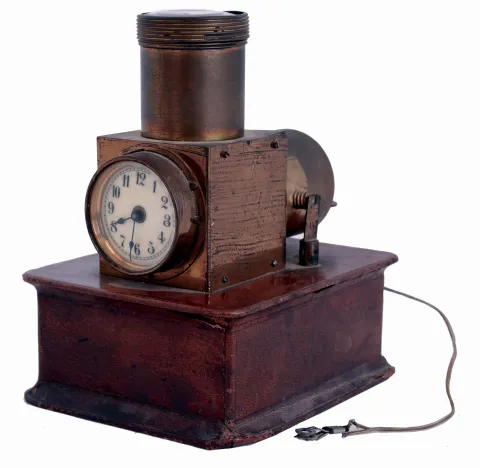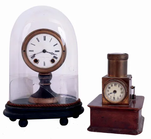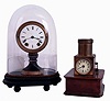 Clocks- 2 (Two): (1) Seth Thomas' Sons & Co., New York, candle stand clock, enamel dial, 8 day timepiece with glass dome, (2) English night projection table clock, 30 hour timepiece on wooden base, marked "J.C. Vickery Regent St W.