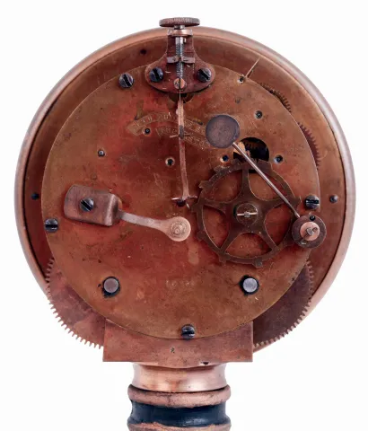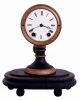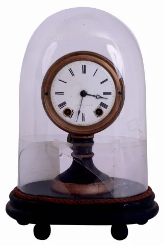 Seth Thomas dirty, base and pedestal repainted, ticks and strikes, dome with missing piece, night clock with minor tarnish, minor losses to leather on wooden base, not running