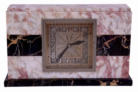 ATO, France, mantel clock, rectilinear Art Deco case constructed of Rosa Norvegia and Portoro marbles, square, Arabic numeral metal dial, steel hands, brass movement marked in part "Leon Hatot Fabricants Paris", c1930