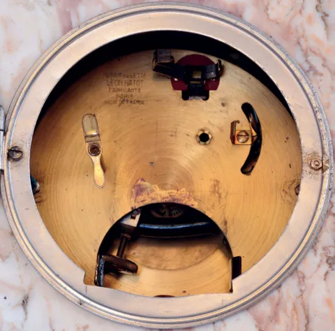 case with a few minor chips and flakes, appears to have been reglued to its base, nickel plated bezel with minor scratches and corrosion, running condition unknown, 9"h x 15"w