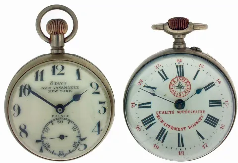 (1) Wanamaker running, setting not functional; (2) typical Swiss movement with lever escapement, running and setting properly. Roskopf relates to his inexpensive escapement designs.