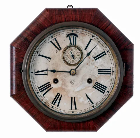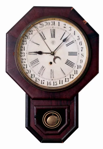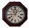 Clocks- 3 (Three) American: (1) Waterbury Clock Co., 8 days, spring driven brass movement drop octagon calendar timepiece, c1900. (2) Atkins Clock Co., 8 days, spring driven brass movement "Octagon Drop" wall timepiece, c1870. (3) Ansonia Clock Co., New York, NY, 8 days, time and strike, spring driven brass balance wheel movement octagon wall clock with seconds dial, c1900. (1) Rosewood veneered case in original finish with some loss on one of the octagon segments and a small chip on the bottom edge. Original paper dial with wear and some abrasion. Original hands and tablet. (2) Refinished rosewood and mahogany veneered case in nice condition. The dial pan now has a replaced paper dial. Original hands. Background paint on the bottom tablet is gone. Remains of a label inside the case with the company name missing. (3) Rosewood veneered case in original finish with loss on the back edges. Original paper dial has age darkened with stains. Original hands.