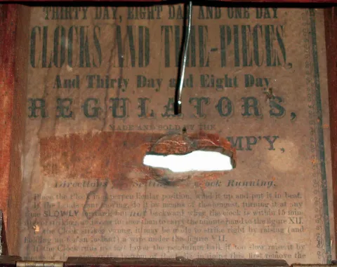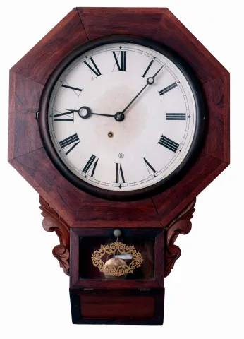 (1) Rosewood veneered case in original finish with some loss on one of the octagon segments and a small chip on the bottom edge. Original paper dial with wear and some abrasion. Original hands and tablet. (2) Refinished rosewood and mahogany veneered case in nice condition. The dial pan now has a replaced paper dial. Original hands. Background paint on the bottom tablet is gone. Remains of a label inside the case with the company name missing. (3) Rosewood veneered case in original finish with loss on the back edges. Original paper dial has age darkened with stains. Original hands.