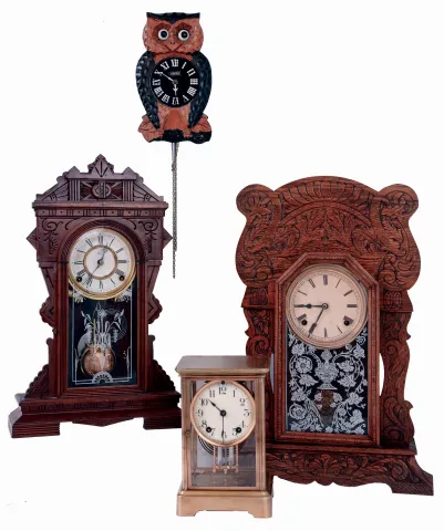 Clocks- 4 (Four): (1) William L. Gilbert Clock Co., Winsted, Conn., "Meteor", 8 days, time and strike, spring driven brass movement shelf clock, c1895. (2) Ansonia Clock Co., New York, NY, "Coral", 8 days, time and strike, spring driven brass movement