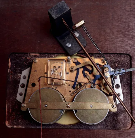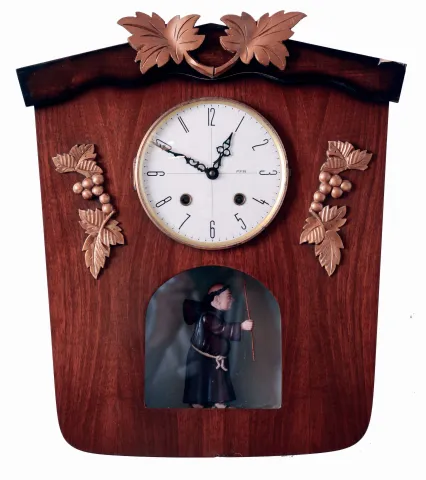 German, 8 days, time and strike, spring brass lever movement animated Monk wall clock. The Monk's arm is pulled up when the clock strikes. Late 20th Century.