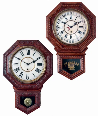 (1) The case has its original finish which has become alligatored. The overall condition of the case is excellent. The dial and hands are original and in excellent condition. The pendulum bob is original. The movement is signed. There is a nice company label on the case back showing the model name. Ht.26 1/2". (2) The case has been refinished. The dial and hands are original and in good condition. The door glass and the "Standard Time" designation are original. Ht 27 3/4".