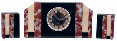 Clocks- 3 (Three): (1) French, 8 days, time and strike, spring driven brass movement porcelain mantel clock. (2) German, 30 hours, spring driven brass movement black and pink marble with contrasting marble inlay art deco style garniture set. (3) French, 8