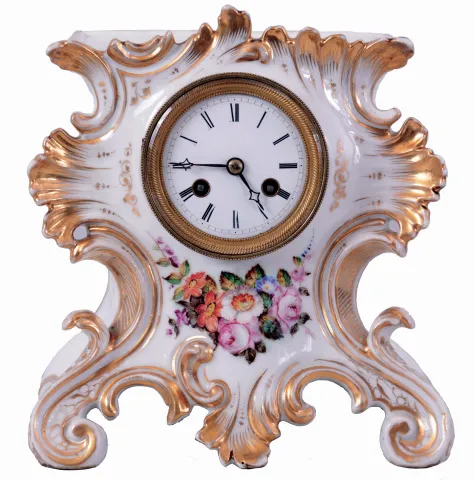(1) White porcelain decorated case in nice condition with some wear to the applied gilding. Original porcelain dial is perfect. Original hands. (2) There are some rough areas on the bottom edges and back corners of the case. The left front has some minor roughness. The matching side pieces have some small chips on the corners. Original silvered dial has has some small scratches. Original hands.(3) Case with minor spots of tarnish. Dial very good. Knob missing on back door. Runs.