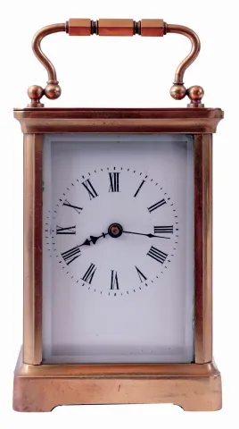Clocks- 3 (Three): (1) French, 8 days, time and strike, spring driven brass movement porcelain mantel clock. (2) German, 30 hours, spring driven brass movement black and pink marble with contrasting marble inlay art deco style garniture set. (3) French, 8 days time only carriage clock, brass case and enamel dial (1) White porcelain decorated case in nice condition with some wear to the applied gilding. Original porcelain dial is perfect. Original hands. (2) There are some rough areas on the bottom edges and back corners of the case. The left front has some minor roughness. The matching side pieces have some small chips on the corners. Original silvered dial has has some small scratches. Original hands.(3) Case with minor spots of tarnish. Dial very good. Knob missing on back door. Runs.