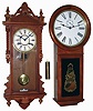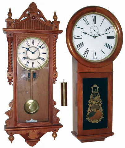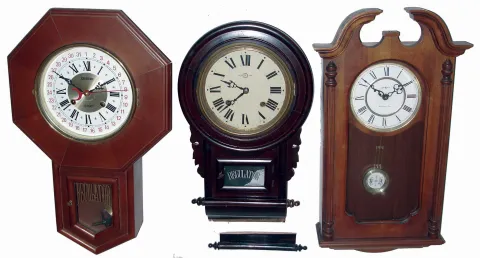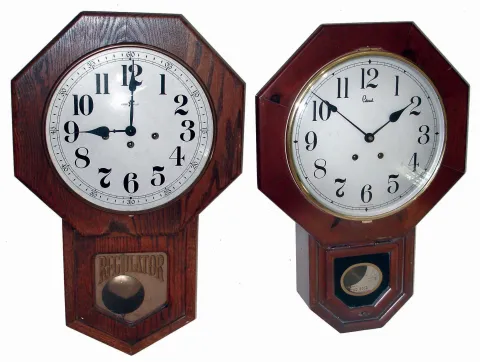 Clocks- 7 (Seven) wood case modern reproduction wall clocks: Seth Thomas No. 2-style; 3 octagon-top schools clocks; 3 other hanging clocks; late 20th century