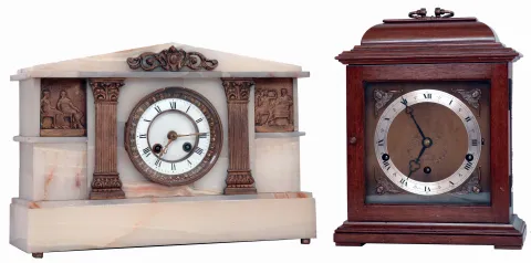 Clocks- 2 (Two): (1) F. W. Elliott, Croydon, England, 8 days, time, strike and Westminster chime, spring driven brass lever movement bracket clock. (2) French, 8 days, time and strike, spring driven brass movement in onyx mantel case with applied metal decoration. (1) Mahogany case in original finish with some dings and scratches to the finish. Original dial with a silvered chapter ring is very nice with original hands. Movement is signed. (2) Onyx case has some roughness on the base corners and the right side top edge. Original porcelain dial has hairline cracks in the center dial. Original hands.