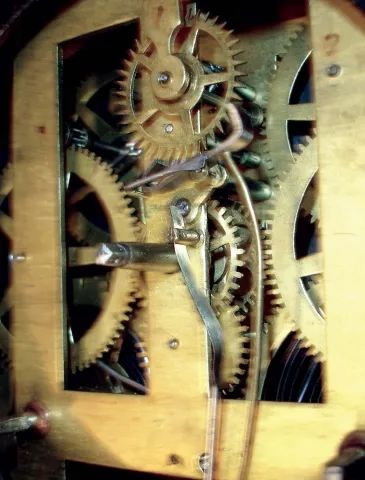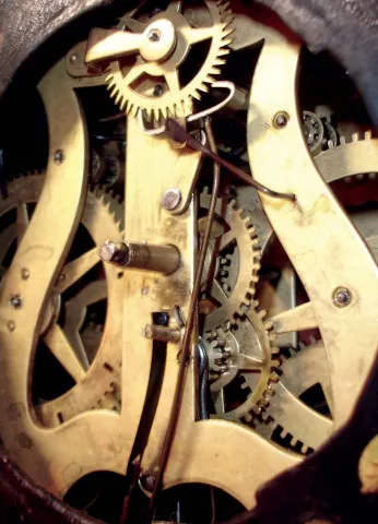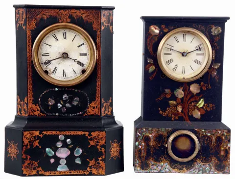 Clocks- 2 (Two): (1) New England Clock Co., Bristol, Conn., iron case mantel clock with gilt design and mother of pearl inlay with a spring driven, 8 days, time and strike movement, c1851. (2) Terry & Andrews, Ansonia Conn., iron case mantel clock with gilt and mother of pearl design and a spring driven, 8 days, time and strike, lyre movement, c1851. (1) The case retains its original finish in good condition. The paper dial has aged with a darker color. The hands are original. Ht 14 3/4". (2) The case retains its original gilt and M.O.P. but may have had a later finish applied, The original painted dial has some restoration. The hands are original, The movement is signed. Ht 13 3/4".