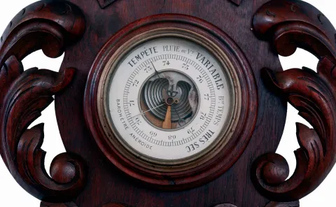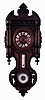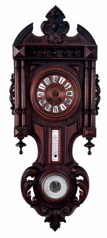 Clocks- 2 (Two): A French wall clock, carved wooden case with cast brass ornament in the rococo style, Roman numeral white enamel dial, 8 days timepiece movement, and a German wall clock, carved walnut case, wooden dial with Roman numeral enamel cartouches, 8 days time and strike movement, with thermometer and barometer, both c1900 French clock case dirty, and with split at bottom, cast ornament good, ticking, Ht 26", German clock with repairs to top of case, drops replaced, ticks and strikes, Ht 36"