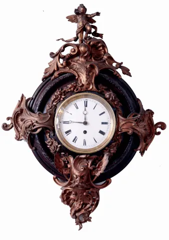 Clocks- 2 (Two): A French wall clock, carved wooden case with cast brass ornament in the rococo style, Roman numeral white enamel dial, 8 days timepiece movement, and a German wall clock, carved walnut case, wooden dial with Roman numeral enamel