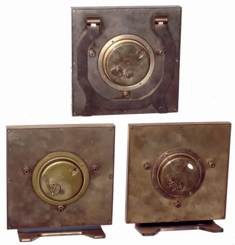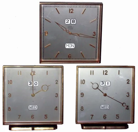 all three tick and set and calendars advance, but were not tested long term so sold as is with no further details available. Cases, dials and cases are in good original condition with some minor wear to the surfaces. Cases are 5" square